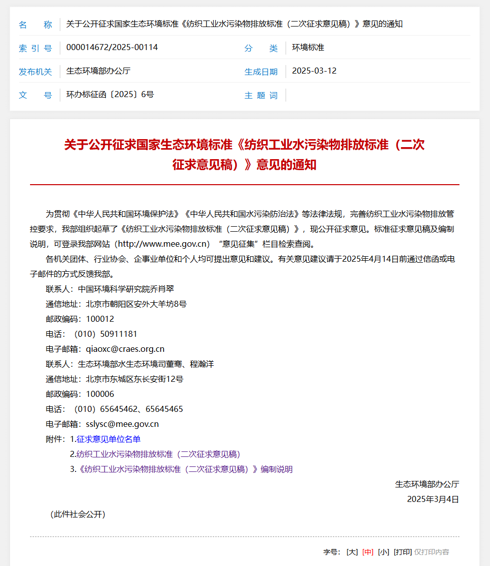 日前,為為貫徹《中華人民共和國環境保護法》《中華人民共和國水污染防治法》等法律法規,完善紡織工業水污染物排放管控要求,生態環境部起草了《紡織工業水污染物排放標準(二次征求意見稿)》,現公開征求意見。
